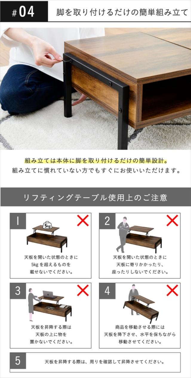 | [天板](リフト閉)約10kg以下(リフト開)約5kg以下 [天板下収納部]約7kg以下 |