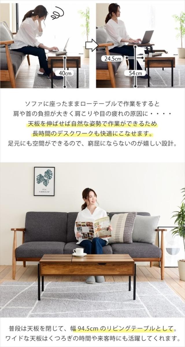 天板を上げるとソファに座って作業するのにちょうどいい高さに。