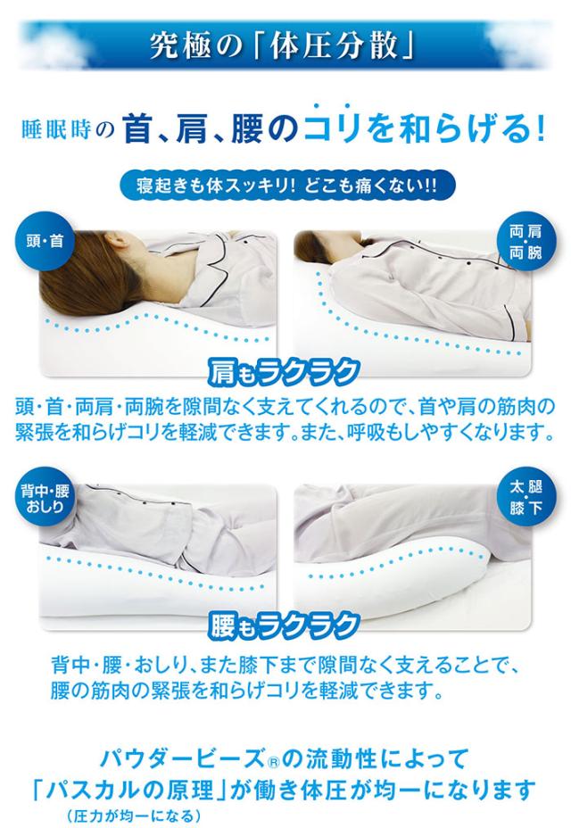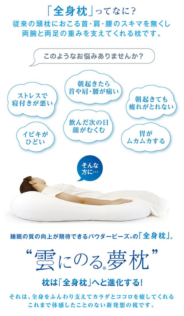 睡眠時の首、肩、腰のコリを和らげるパウダービーズの「全身枕」。