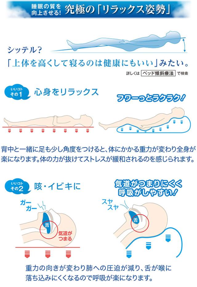 頭・首・両肩・両腕・背中・腰・おしり・膝下まで隙間なく支えてくれるので、首や肩、腰の筋肉の緊張を和らげコリを軽減し、呼吸もしやすくなります。