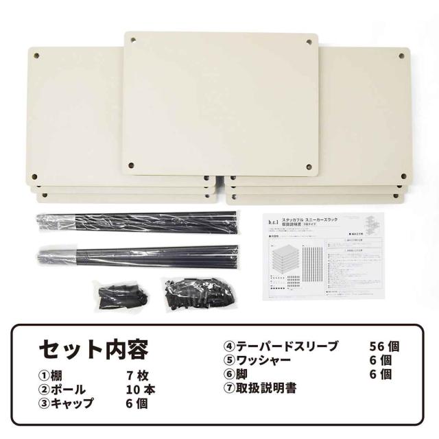 | 内容量 | ポール:10本 棚:7枚 テーパードスリーブ:56個(+予備2個) 脚:6個 キャップ:6個 ワッシャー:6個 |