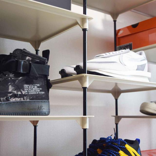 お気に入りのスニーカーはもちろん、スニーカーボックスもディスプレイできるシューズラックです。7枚棚が入ったセットです。