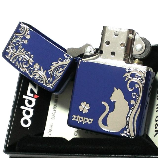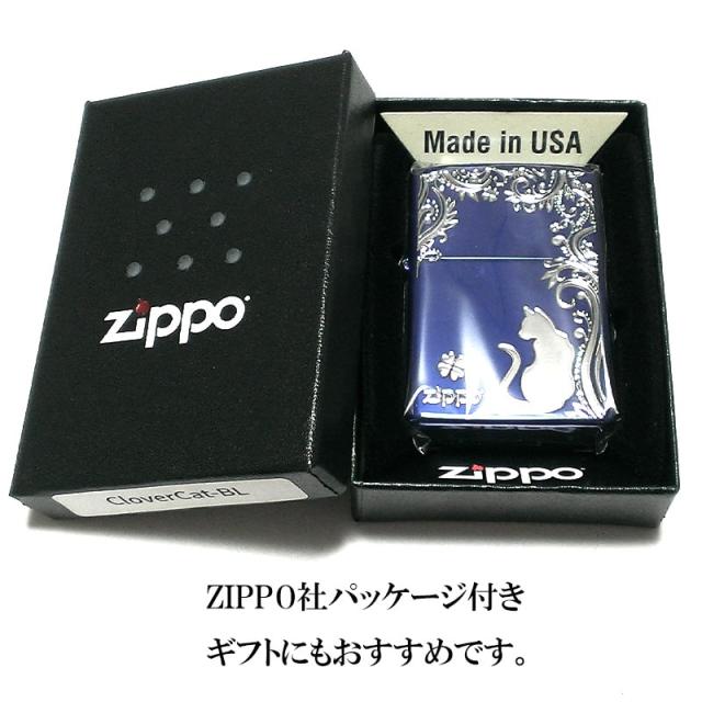 ZIPPO ライター ねこ キャット ジッポ 猫 クローバー 青 ロゴ 四つ葉 かわいい おしゃれ ジッポー ブルー 銀差し ネコ 可愛い 女性 レディース メンズ ギフト プレゼント
