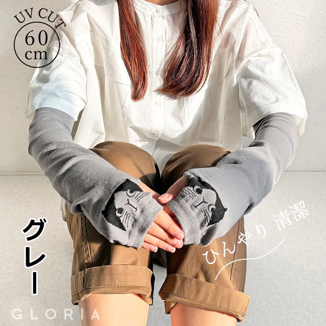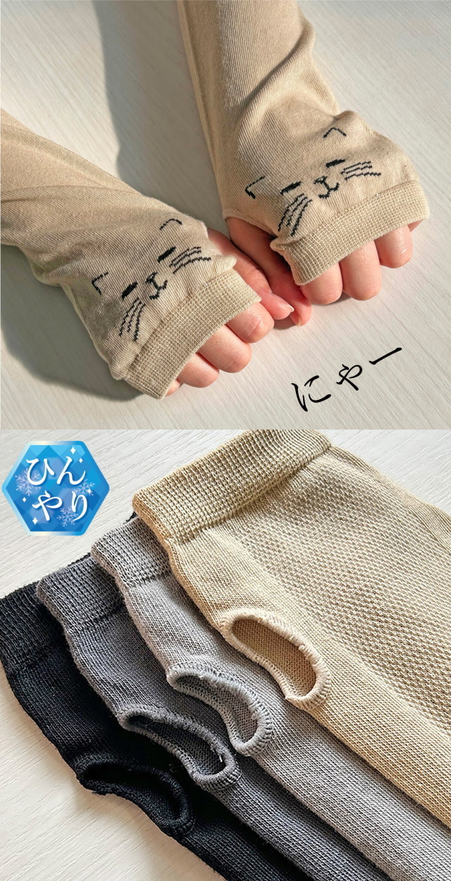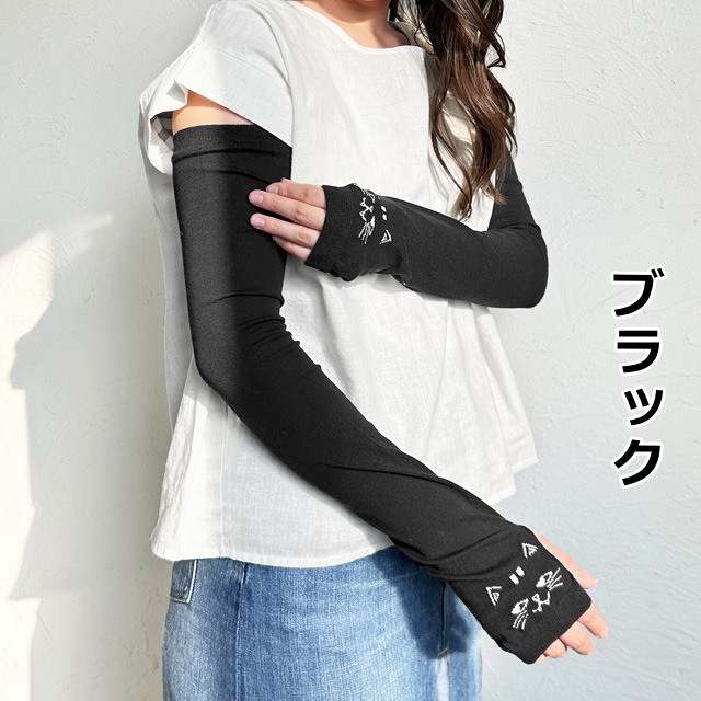 アームカバー レディース 猫柄 UVカット 春 夏 綿混 指なし ロング 60cm丈 ブラック グレー ベージュ 日よけ 手袋 腕カバー 涼しい 接触冷感 抗菌防臭 UV対策 冷え対策 かわいい おしゃれ ギフト プレゼント 【 誕生日 】