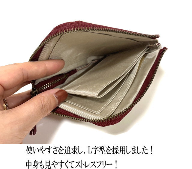 L字ファスナーでスムーズに開閉し、口も大きく開くため、中身が見やすく、お金の出し入れも楽々。