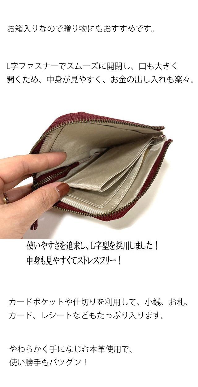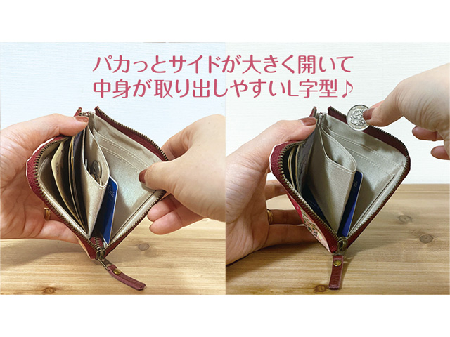 L字ファスナーでスムーズに開閉し、口も大きく開くため、中身が見やすく、お金の出し入れも楽々。