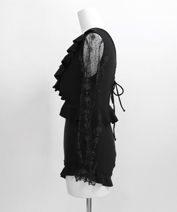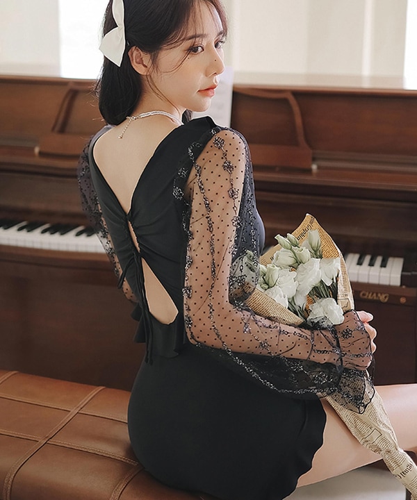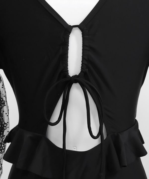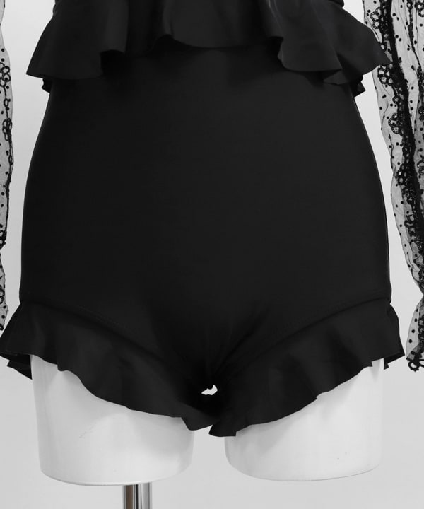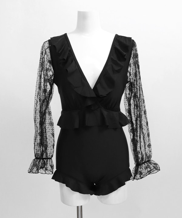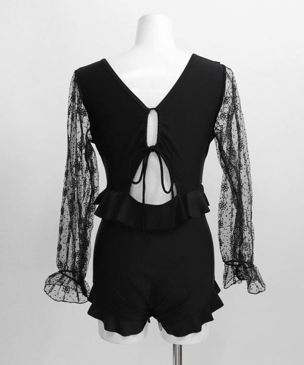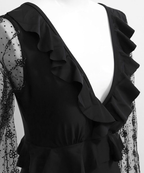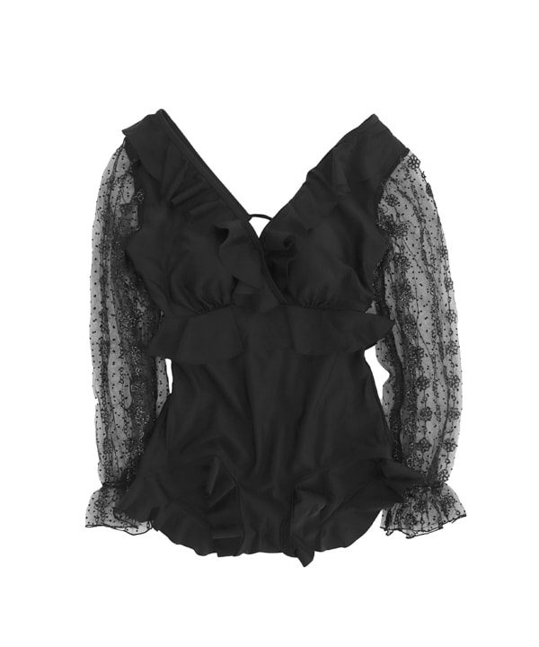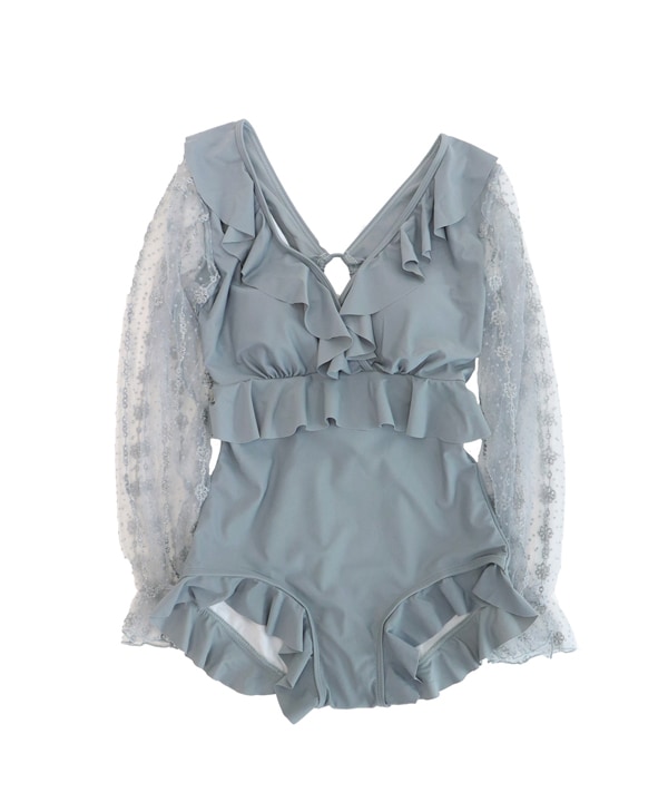 エアリーでシアーな透け感の袖と甘いフリルでロマンティックに仕上げるワンピース水着。