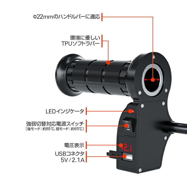 温度調整可能なヒーター、USBコネクタ、デジタル電圧計を備え、冬のバイク通勤、通学、ツーリングなどを温かく快適にしてくれます。