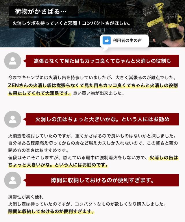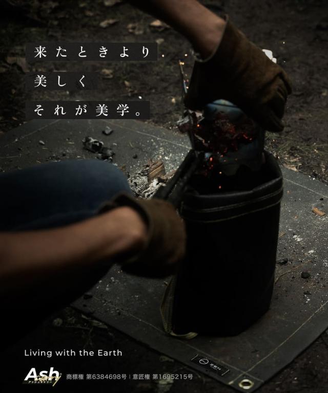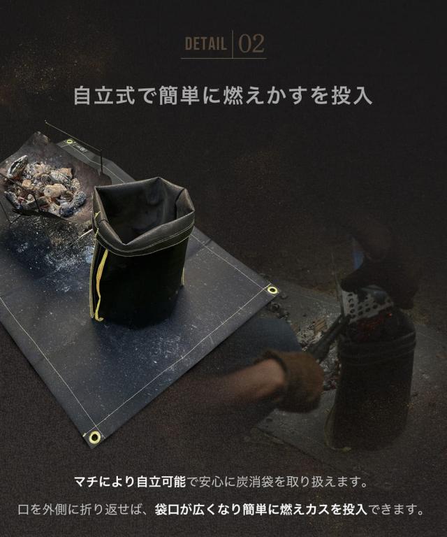 ・耐熱性素材で作られ、まだ少し熱を持った使用後の炭や薪の燃えカスを入れ、袋の口を締めることで自然な鎮火を促し、安心安全に炭を持ち帰ることができる燃えカス用袋です。