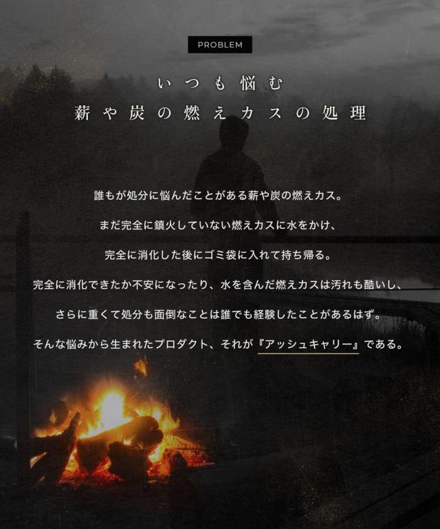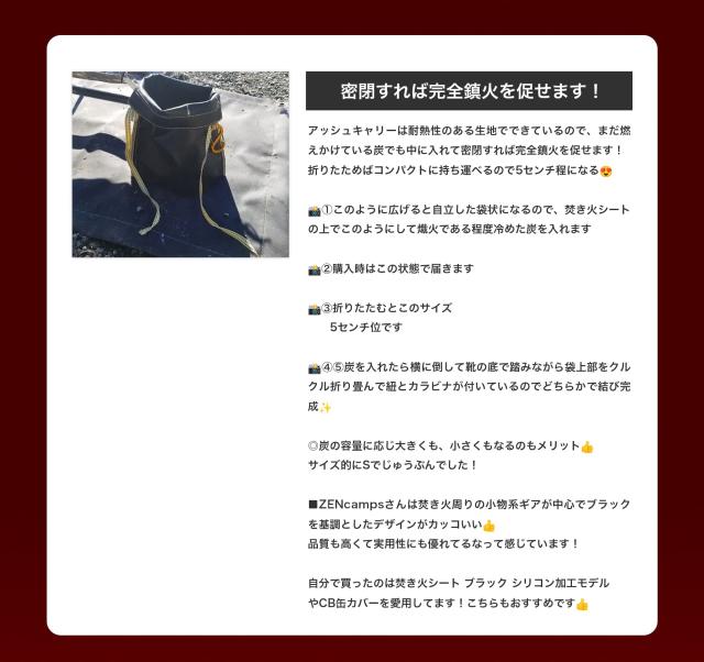 炭や薪の燃えカスを処理できないキャンプサイトで。ちょっとしたデイキャンプで小さいウッドストーブ等で少し焚き火をした後の薪の燃えカス処理に。 炭や薪を入れない場合は、ちょっとしたゴミを入れる袋として。 家や近所の公園などで楽しむBBQの炭処理に。