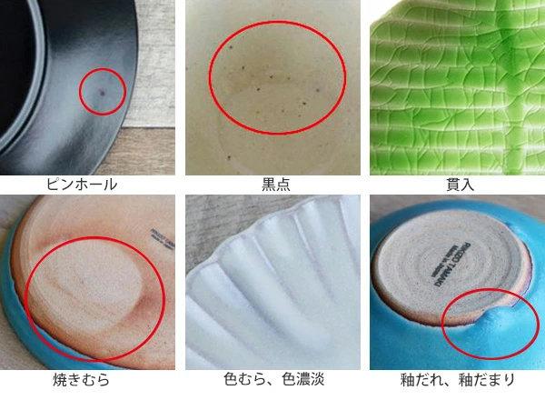 原料や製造方法により、上記のような特性がみられる場合があります。ひとつひとつのうつわの持つ個性、温かみある風合いとしてお楽しみいただければ幸いです。
