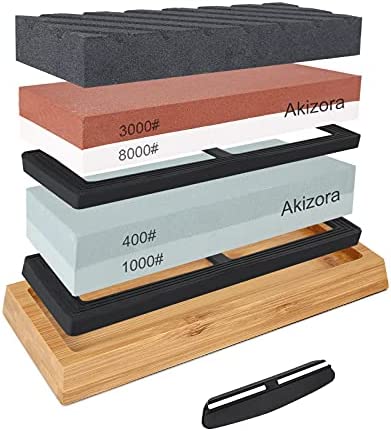 Akizora 砥石 包丁研ぎ石 400 1000 3000 8000 両面砥石 2点セット 竹製滑り止め台付き 面直し付き 角度固定ホルダー付き 家庭用中砥石 仕上砥石 包丁 仕上げに最適