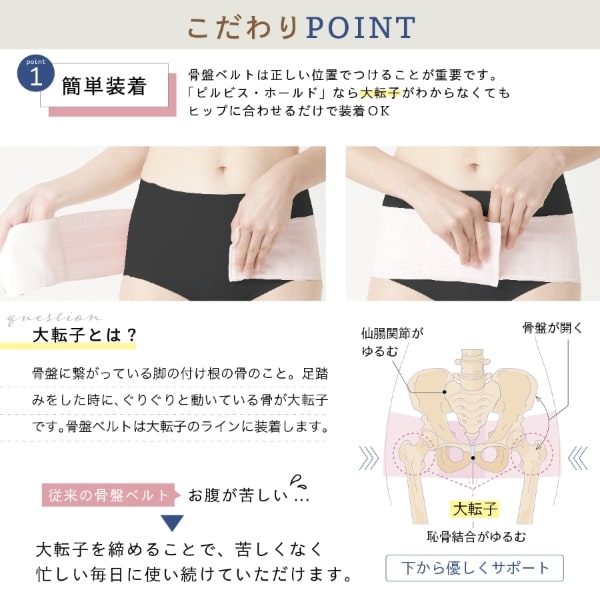 ピルビス・ホールドは骨盤を整えることに特化しながらも、育児中でも毎日快適に着用していただけるよう術後、産後ケアのプロが考案した骨盤ベルトです。