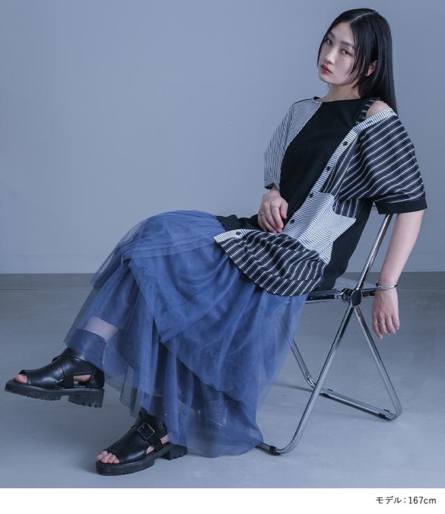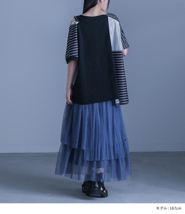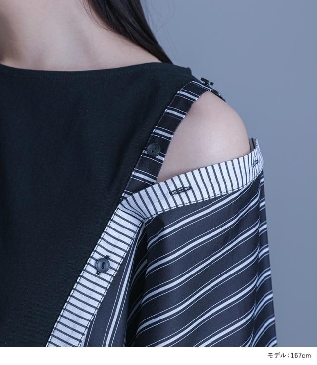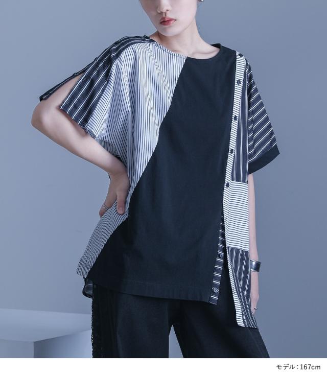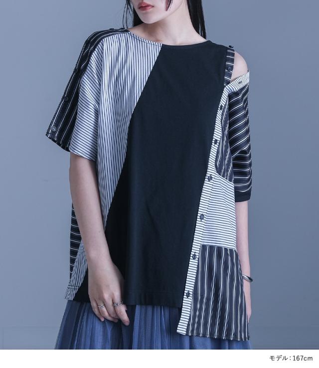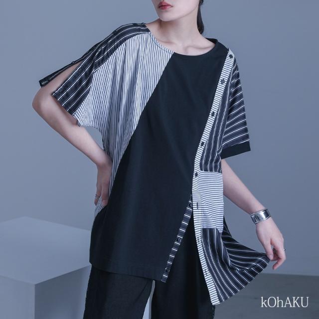『kOhAKUストライプ柄切替ボタン開きアシメTシャツ』 ※メール便可※【10】[Tシャツ カットソー 春夏 レディース トップス 半袖 五分袖 綿100% 異素材 アシンメトリー 肩あき スラッシュ 変形 イレヘム 肌見せ モード thk0347]