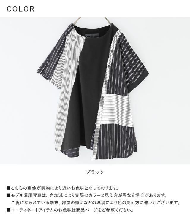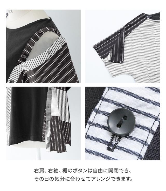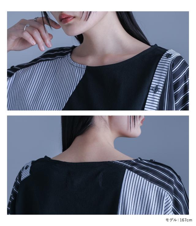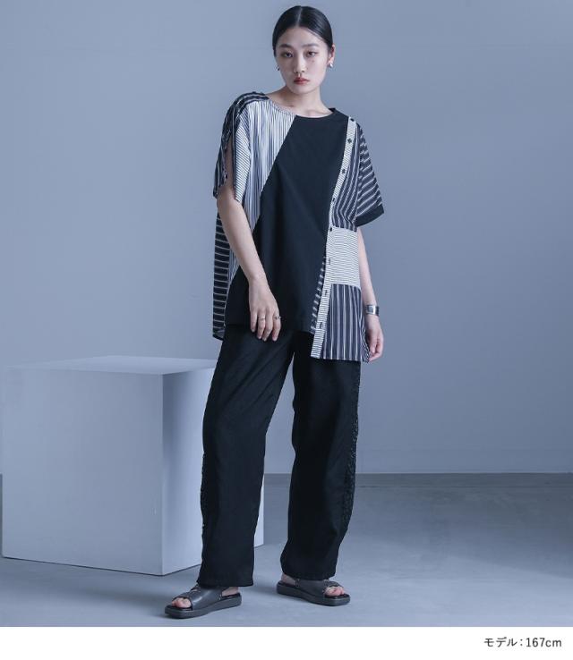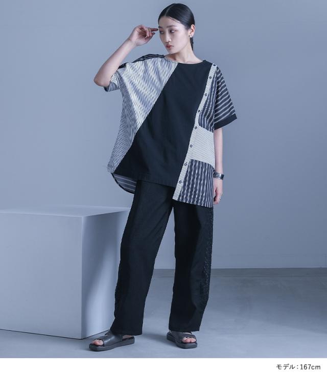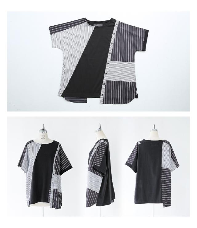 レディース トップス Tシャツ カットソー プルオーバー クルーネック 半袖 五分袖 袖コンシャス 変形 肩開き 肩あき アレンジ 切り替え アシンメトリー アシメ スリット スラッシュ開き バックシャン ボタン開き ストライプ柄 配色 無地 綿100% コットン100% 異素材MIX イレギュラーヘム イレヘム 肌見せ おうちで洗える 調節できる 調整可能 春夏 カジュアル 大人女子 大人可愛い お洒落可愛い モード ラフ かっこいい Sサイズ Mサイズ Lサイズ LLサイズ 3Lサイズ XLサイズ フリーサイズ ぽっちゃり 体型カバー 大きいサイズ kOhAKU コハク ブラック 黒 モノトーン マルチカラー ミックスカラー バイカラー 【トップス】[ID]thk0347[kOhAKUストライプ柄切替ボタン開きアシメTシャツ]