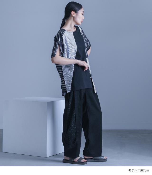 ■デザイン ランダムな切り替えデザインと3種類の生地を組み合わせた異素材使いがモードな雰囲気を作り出す、表情豊かなデザインTシャツ。左肩、右袖、裾はボタンの開閉によってシルエットや肌見せの調整が可能で、その日の気分に合わせて着こなしのアレンジを楽しめます。肩や袖、裾のボタンを開けることで、さり気ない肌見せと大人の抜け感をプラス。前身頃の前立て部分は下側もストライプの切り替えデザインで、さり気ないアクセントに。アシンメトリーなヘムラインが、他にはないこなれ印象に仕立てます。左右で異なる袖デザインや、後ろ身頃の切り替えデザインなど、360°どこから見ても洗練されたモードな印象を与えます。 ■コーディネート デザイン性がありながらもモノトーンでまとめており、様々なアイテムと合わせてご着用いただけます。デザイン性のあるボトムスや同系色のボトムスと合わせることでこなれた印象に、シンプルなボトムスと合わせることで洗練されたモードな印象が完成します。 ■素材 優しい肌触りコットン100%素材を使用したカットソー生地と、細めのストライプ柄で魅せるコットン100%素材のシャツ生地、綺麗めな印象が叶うストライプ柄のスーツ生地の3種類の異素材生地をドッキング。程よく薄手な生地感で、暑さを感じる時期の着用に最適です。 |