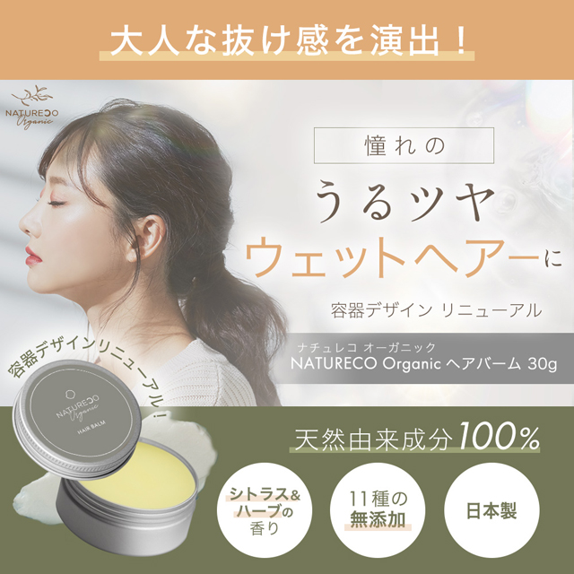 | 商品特徴 | 髪を保湿・乾燥ケアしながら濡髪を演出!NATURECOオーガニックのヘアバーム |