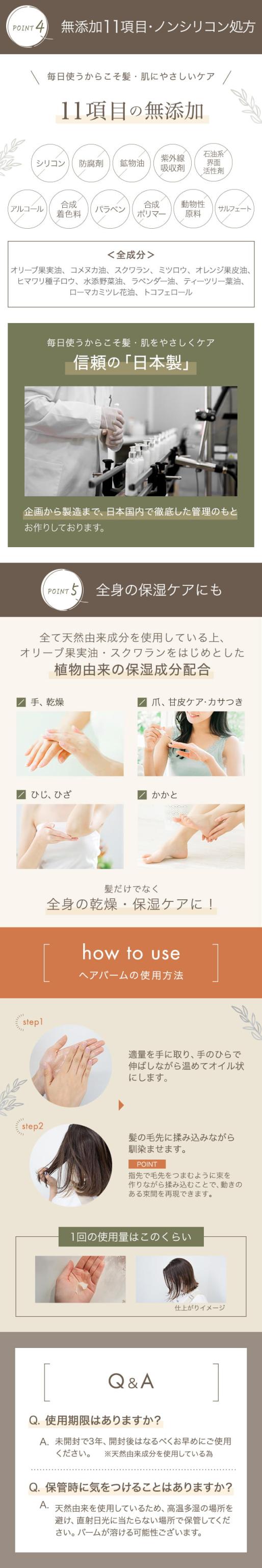 | 使い方 | 指先で適量をとり、手のひらでオイル状にした上で、毛先を中心に動きを出したい部分に馴染ませます。 天然由来成分100%なので、手に余ったオイルはハンドケア、乾燥した肘・膝・踵などのケアにもお使いいただけます。 |