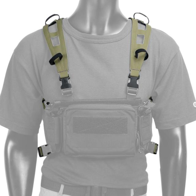 1インチバックルを備えたチェストリグに対応するハーネス。レーザーカットで肉抜きされた本体は軽量かつ通気性抜群。内側メッシュ生地になっており蒸れにくく長時間の着用でもストレスになりにくくなっています。ベルクロリングが取り付けられており無線機ケーブなどをまとめられるようになっています。
