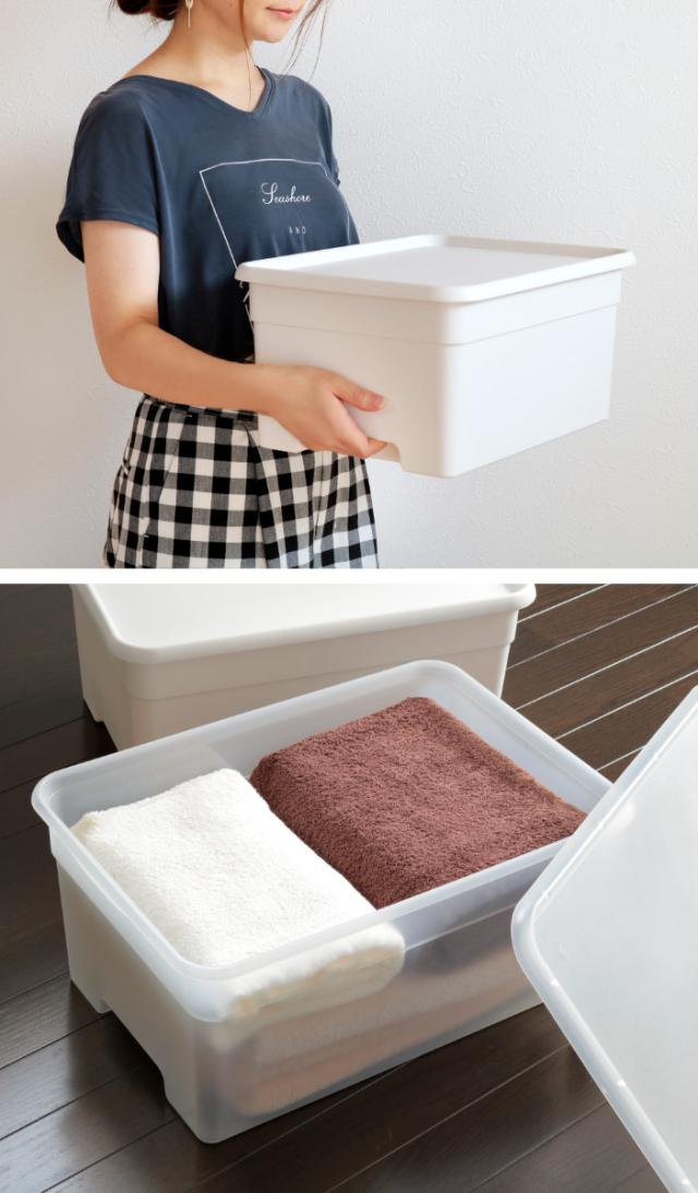 フタ付きなのでホコリが入るのを防ぎ、上に物を乗せる事ができます。しっかり閉まるので、棚への出し入れの際にフタがずれにくく安心です。