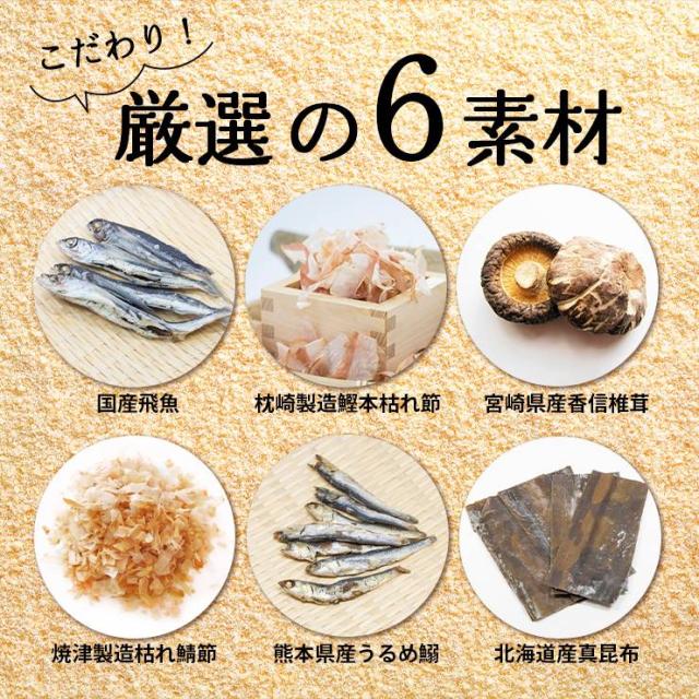 国産飛魚、焼津製造枯れ鯖節、熊本県産うるめ鰯、枕崎製造鰹本枯れ節 、北海道産真昆布、宮崎県産香信椎茸