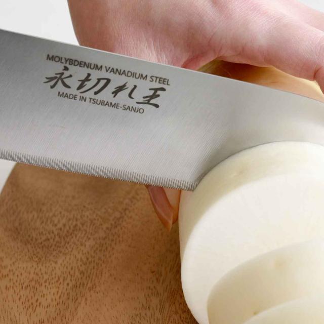 直刃と波刃の長所を生かし、切れ味を持続させる細かなノコ刃加工が施されているので、魚やバラ肉もスパッと切れます。刃はモリブデンバナジウム鋼なのでサビに強く耐久性抜群です。