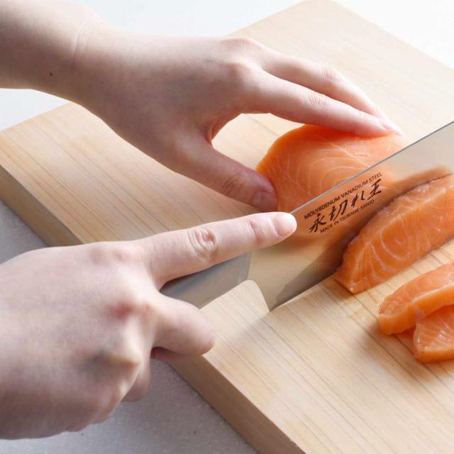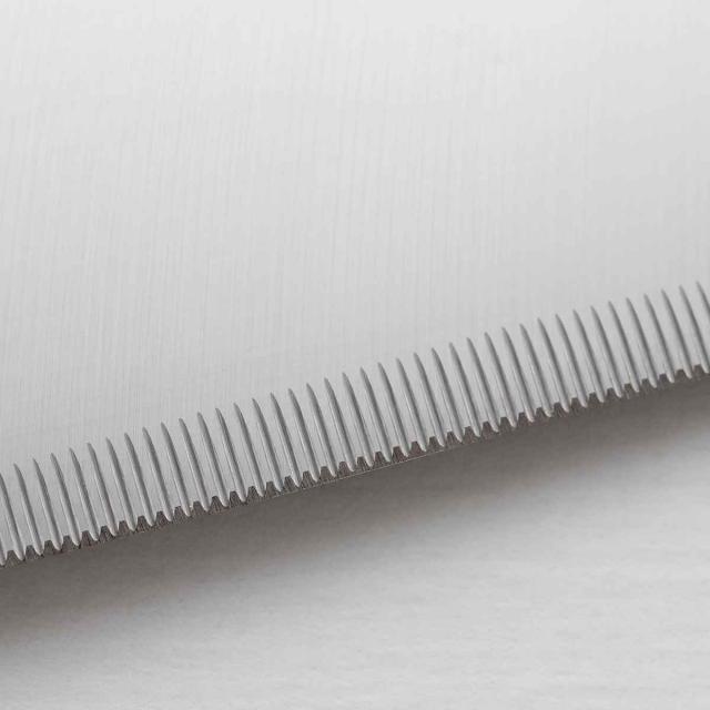 ●よく切れて長く切れ味を持続させる細かなノコ刃加工(ファインソー加工)を施してあるので魚やバラ肉もスパッと切れます。