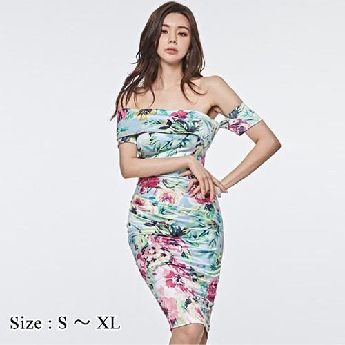 【グラシア】 キャバ ドレス キャバドレス ワンピース ミディアムドレス オフショル シルエット タイト ボディライン 花柄 鮮やか ボタニカル ボディコン ライトブルー/花柄 S M L XL