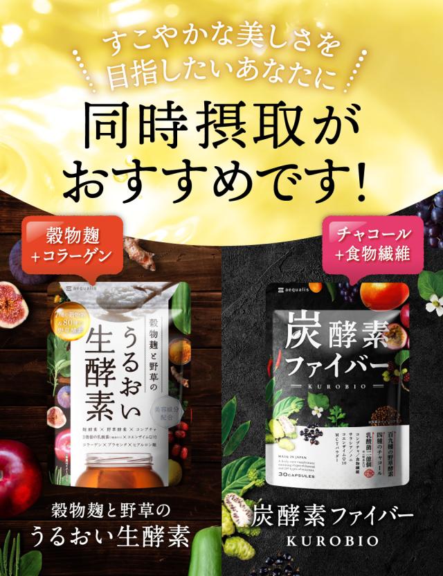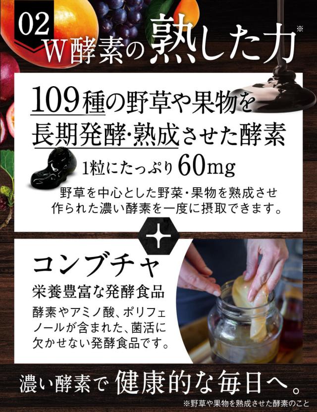 ■【W酵素の熟した力】109種類の野草や果物を長期発酵・熟成させた酵素と、ポリフェノールやアミノ酸が含まれた栄養豊富な発酵食品であるコンブチャのWの酵素を配合。1粒あたり60mgの濃い酵素。