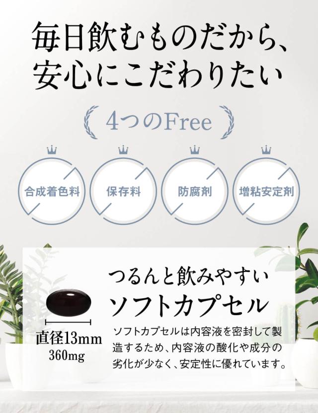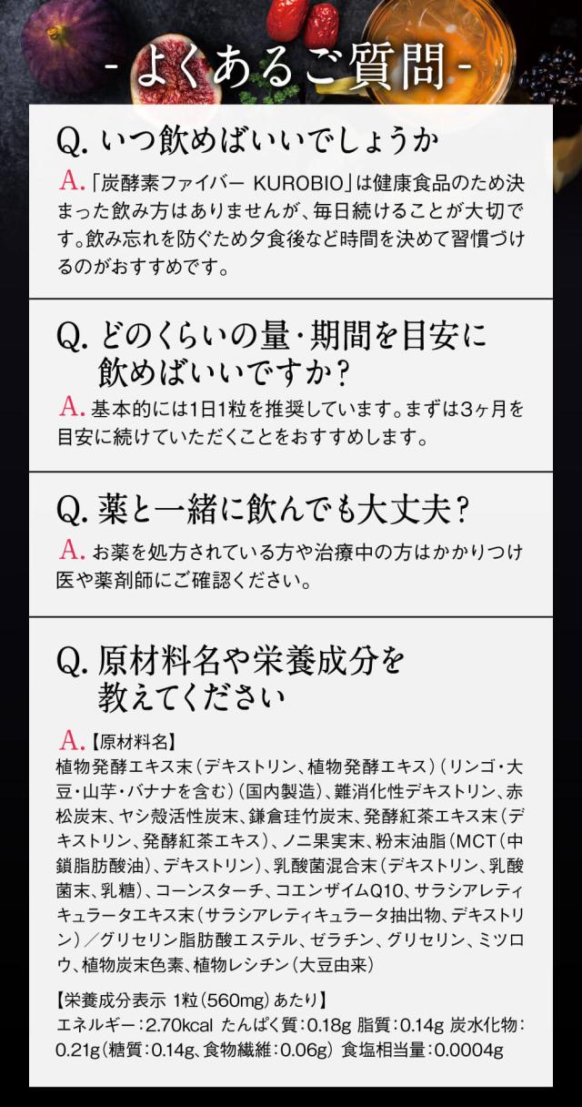 植物発酵エキス末(デキストリン、植物発酵エキス)(リンゴ・大豆・山芋・バナナを含む)(国内製造)、難消化性デキストリン、赤松炭末、ヤシ殻活性炭末、鎌倉珪竹炭末、発酵紅茶エキス末(デキストリン、発酵紅茶エキス)、ノニ果実末、粉末油脂(MCT(中鎖脂肪酸油)、デキストリン)、乳酸菌混合末(デキストリン、乳酸菌末、乳糖)、コーンスターチ、コエンザイムQ10、サラシアレティキュラータエキス末(サラシアレティキュラータ抽出物、デキストリン)/グリセリン脂肪酸エステル、ゼラチン、グリセリン、ミツロウ、植物炭末色素、植物レシチン(大豆由来)