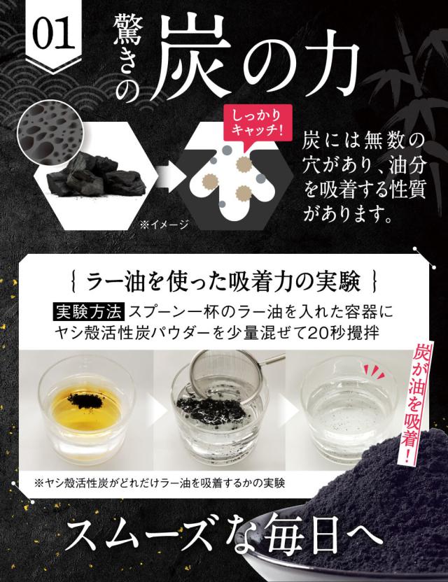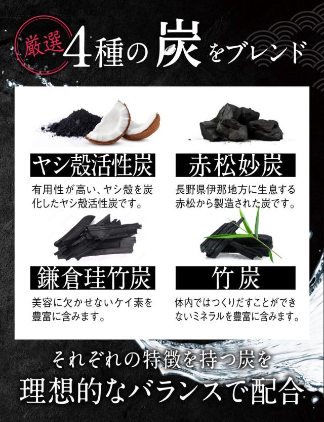 ■【炭の力】ヤシ殻活性炭、赤松妙炭、鎌倉珪竹炭、竹炭、それぞれの特徴を持つ炭(チャコール)を理想的なバランスで配合。炭には無数の穴があり、油分を吸着する性質があり、スムーズな毎日へ導きます。