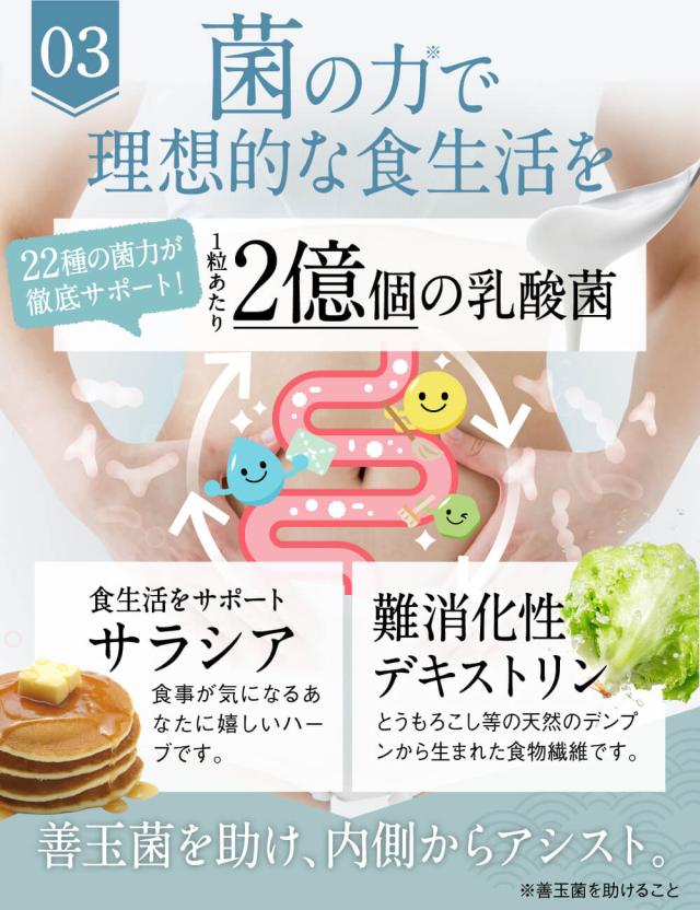 ■【菌の力】善玉菌を助ける3つの原料が内からアシストします。22種類の乳酸菌が2億個含まれます(1粒あたり)。サラシアには食事が気になる方に嬉しいハーブ。さらに第6の栄養素とも言われる食物繊維にも着目し、難消化デキストリンも配合。3つの要素で理想的な食生活を送りましょう。