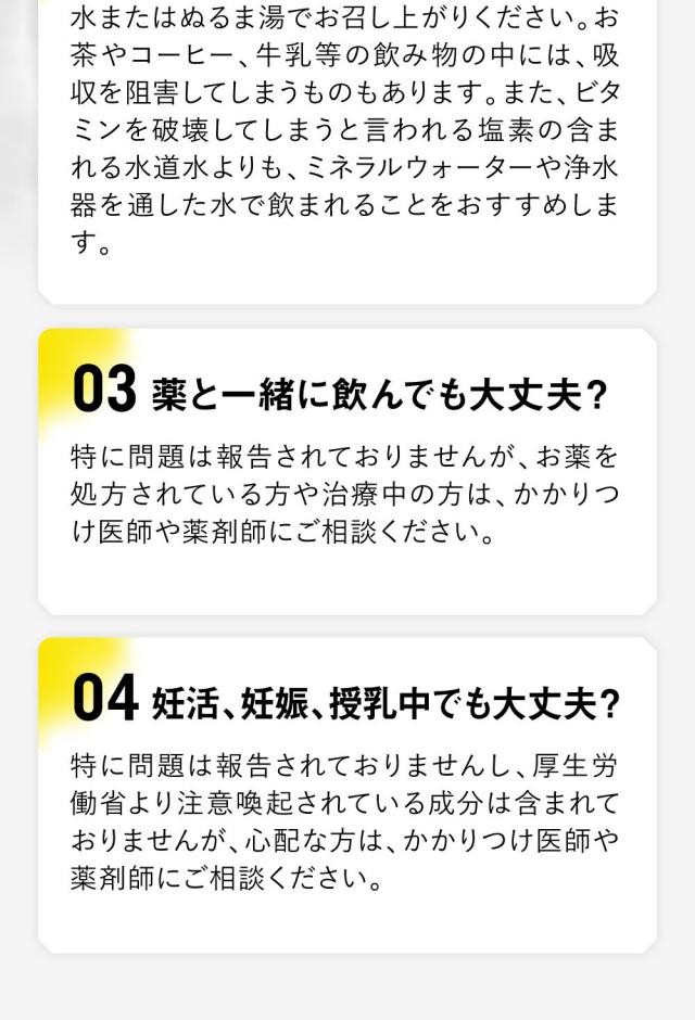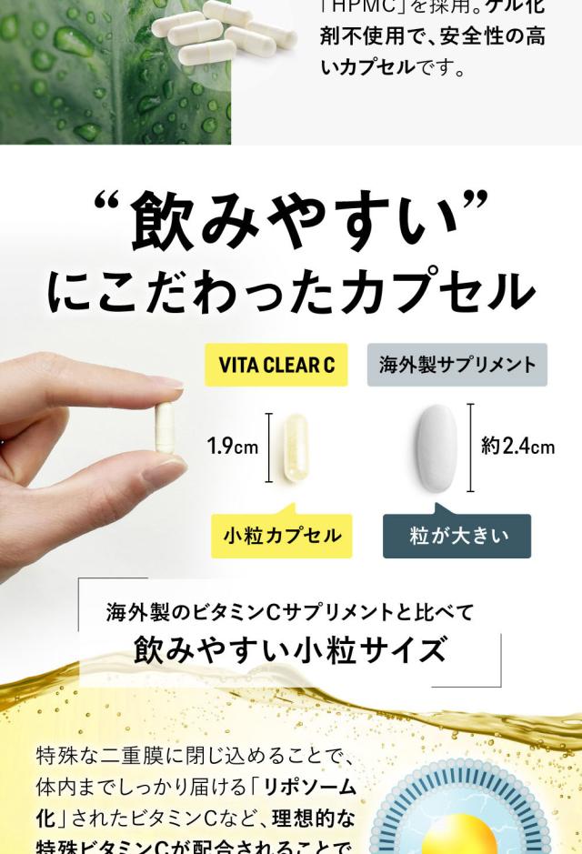 ●HPMCカプセルを採用。カプセルの含有水分が低いため、水分により安定性が失われやすいビタミンCの入れ物として最適なカプセルです。乾燥条件下でも割れにくいという特性もあります。