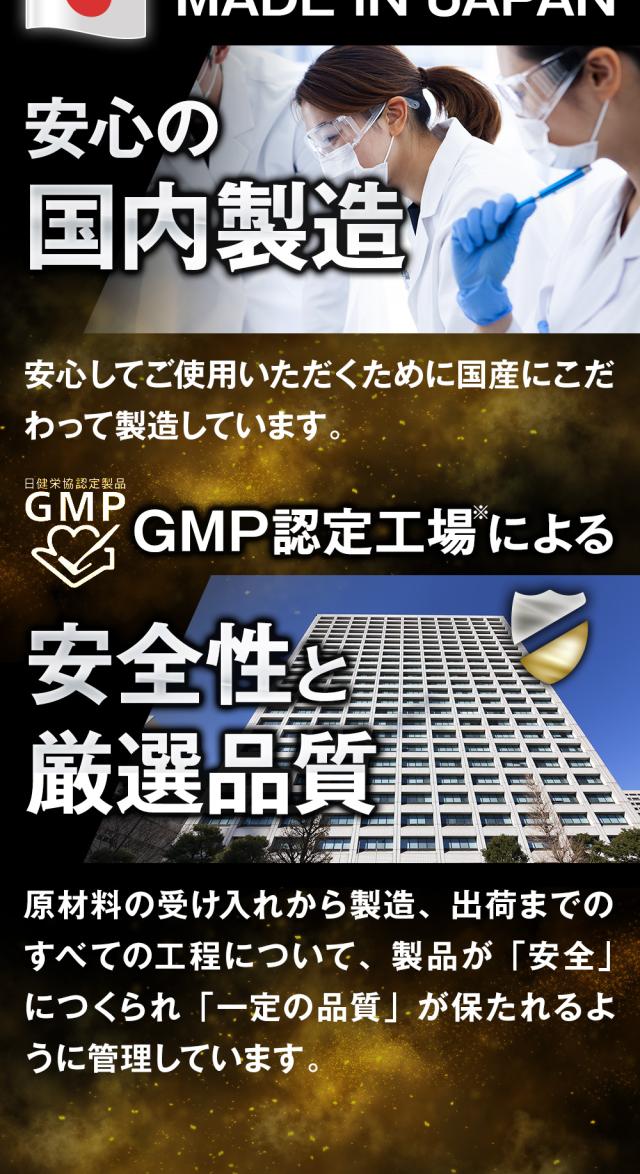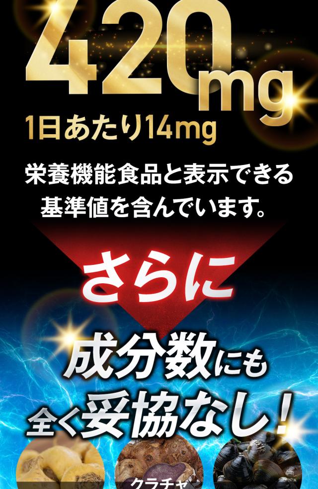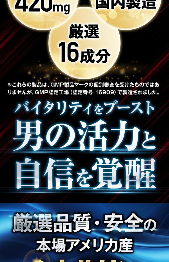 さらにアルギニンも競合商品の中でハイクラスの22,500mg(1日6粒目安:750mg)配合。男の魅力アップには欠かせない「亜鉛」も420mg(1日6粒目安:14mg)と栄養機能食品としての限界量を配合。もちろんGMP認定された国内工場で製造しております。