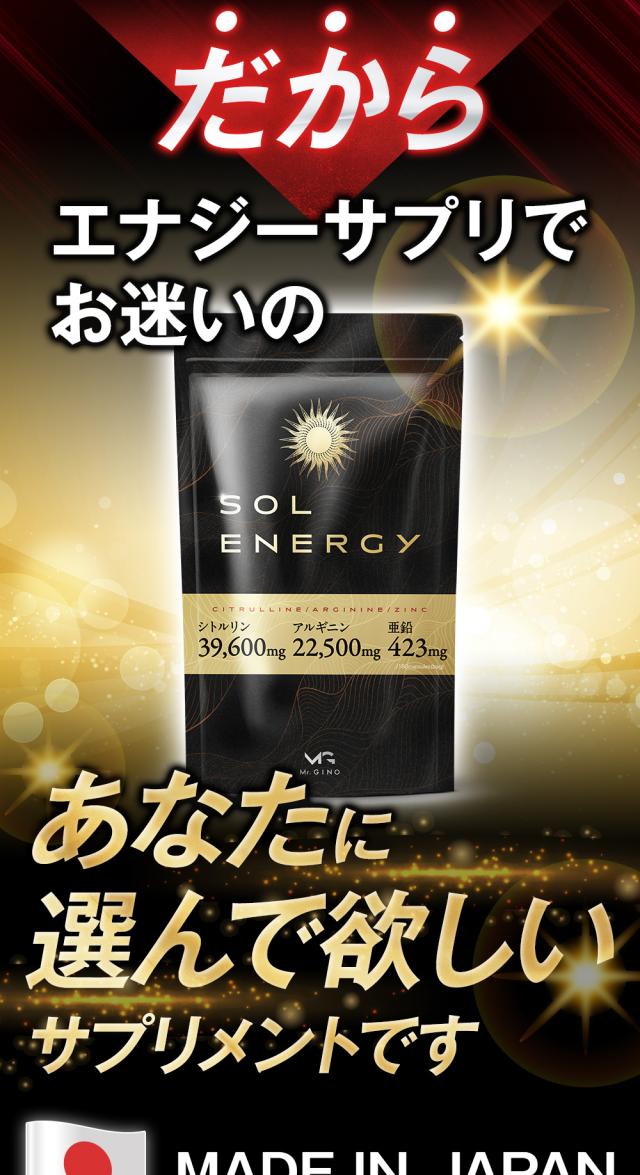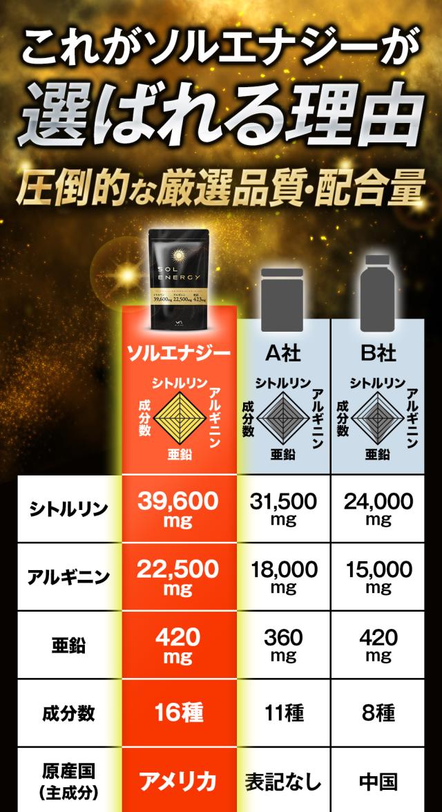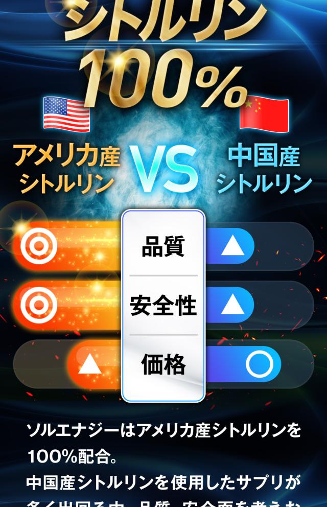 高品質の本場アメリカ産L-シトルリンを39,600mg(1日6粒目安:1,320mg)配合。他の多くのエナジーサプリが原料の安い中国産シトルリンを使う中、Mr.GINO ソルエナジーは採算度外視で高品質アメリカ産のシトルリンを採用。利益が出なくても品質・安全性を第一に、お客様の実感主義を貫きました。