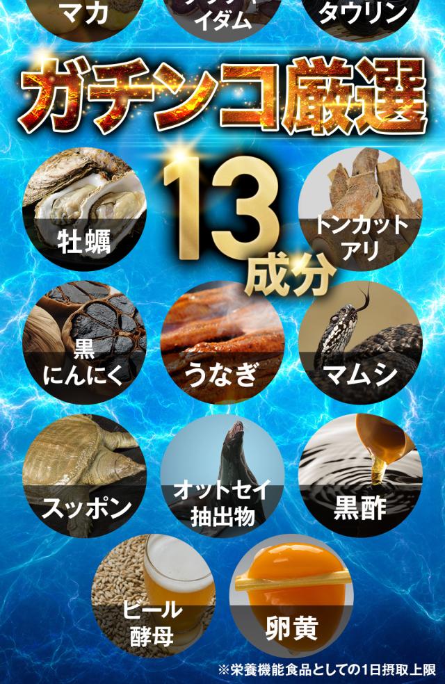 シトルリン、アルギニン、亜鉛以外にも厳選13種類(マカ/トンカットアリ/クラチャイダム/タウリン(抽出物)/発酵黒にんにく/ビール酵母/オットセイ骨格筋肉抽出物/牡蠣/スッポン/うなぎ/黒酢/卵黄/マムシ)※精力剤ではありません