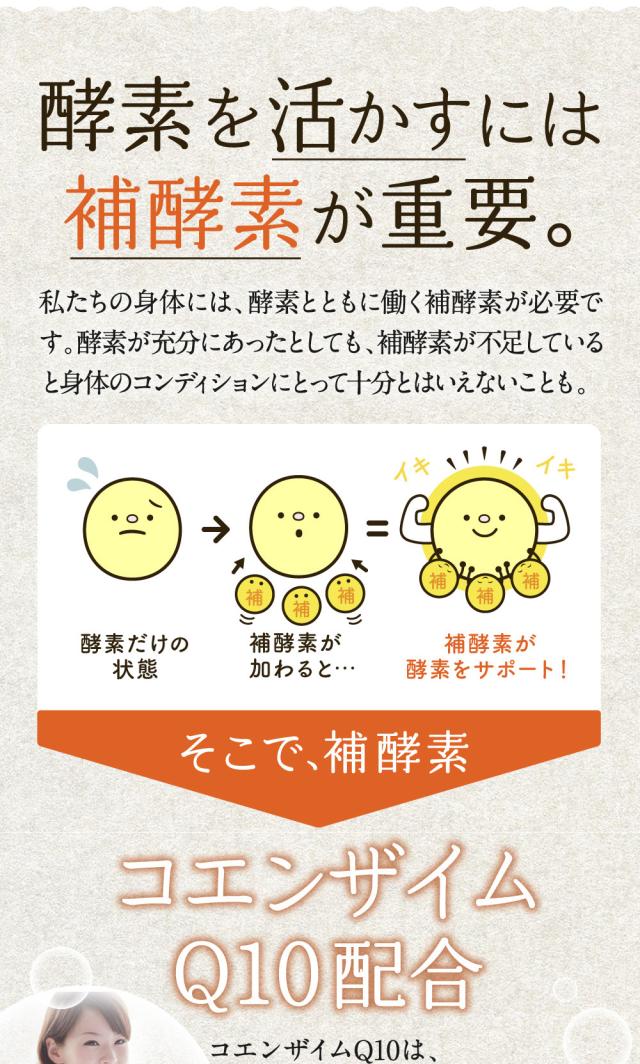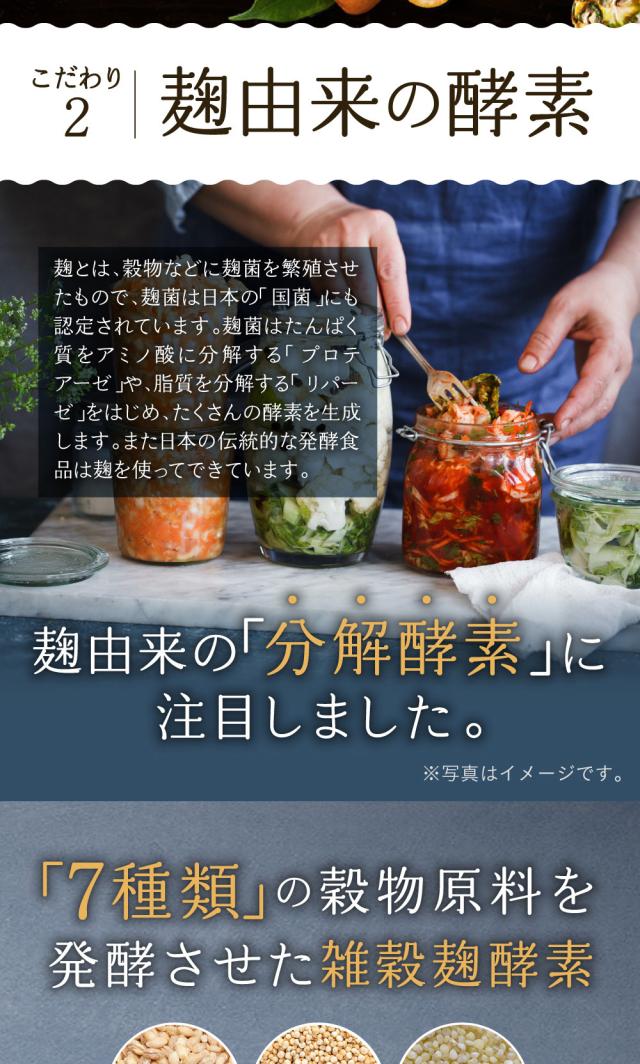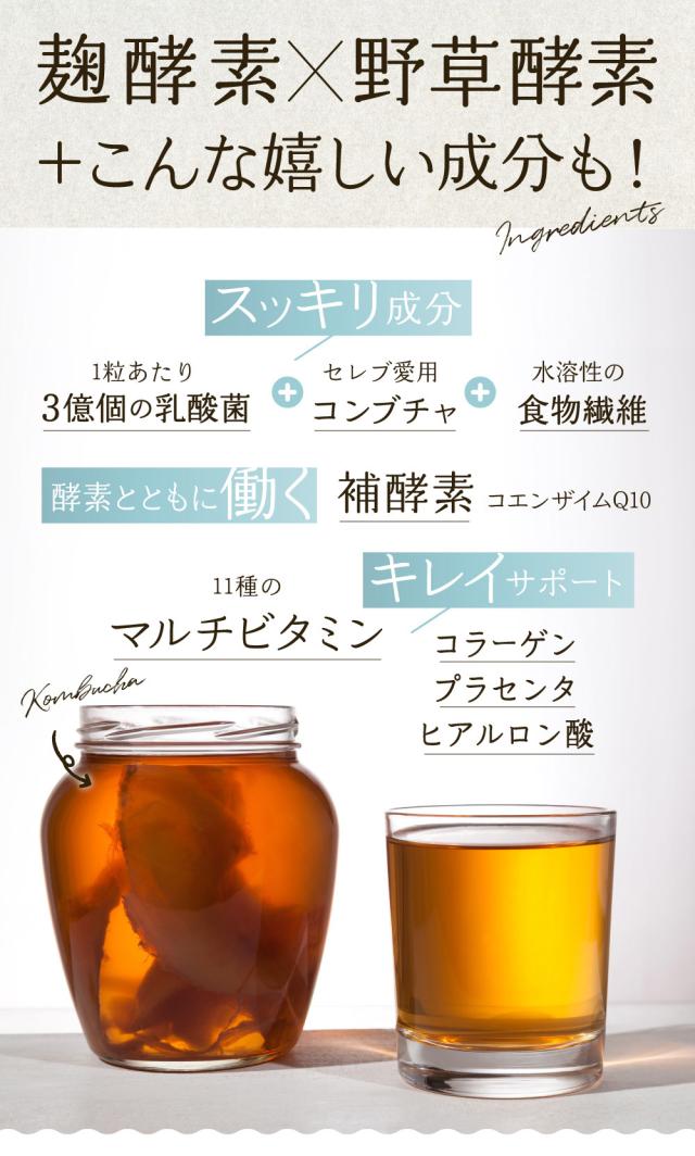 ■厳選した7種の麹酵素と80種の植物酵素などをバランスよく配合、毎日のキレイと健康がテーマのボディケアサプリメントです。美容成分には、話題のコンブチャ、青パパイヤ、プラセンタのほか、ヒアルロン酸、コラーゲン、ビタミン11種類を配合。1粒に22種類の菌種、3億個の乳酸菌もぎっしりで、カラダの中からすっきりをサポート。補酵素としてコエンザイムQ10を配合し、酵素のチカラを引き出します。