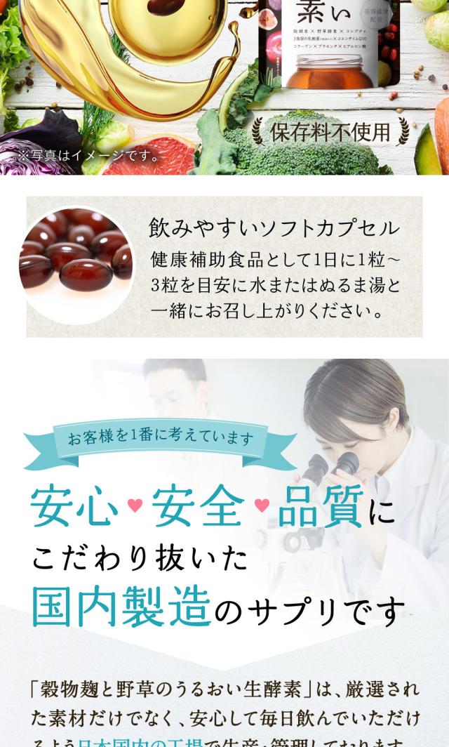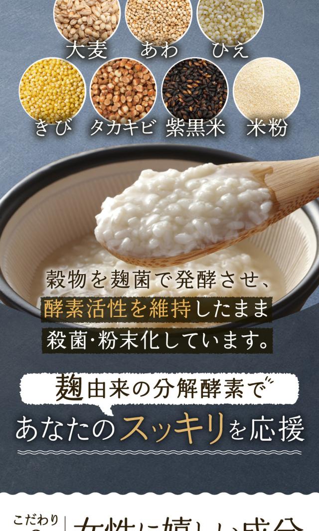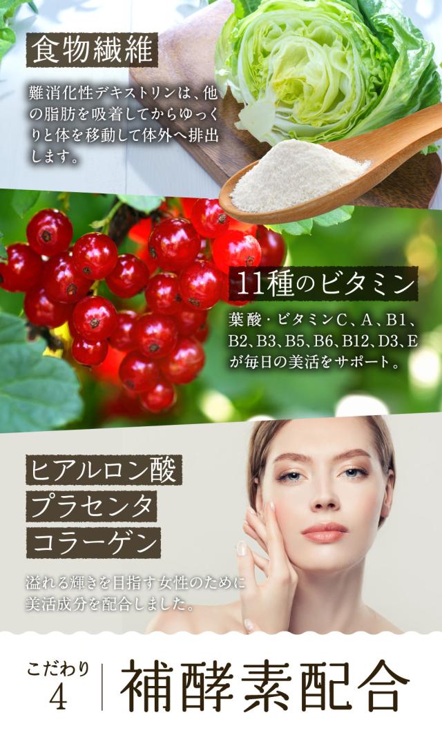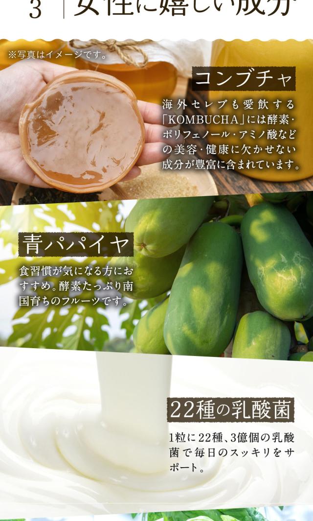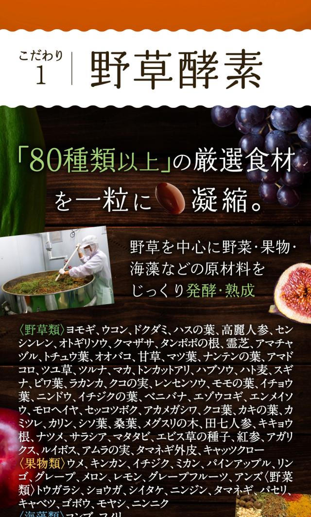 植物発酵エキス(糖蜜、黒砂糖、ヨモギ、ウコン、その他)(国内製造)、穀物麹(大麦、あわ、ひえ、きび、タカキビ、紫黒米、米粉)、食用オリーブ油、食用ぶどう油、食用こめ油、食用ひまわり油、食用アマニ油、デキストリン、難消化性デキストリン、食用サフラワー油、発酵紅茶エキス、コエンザイムQ10、乳酸菌混合末、パパイヤエキス、乳糖、プラセンタ抽出物、コラーゲンペプチド/ゼラチン、グリセリン、ミツロウ、グリセリン脂肪酸エステル、カラメル色素、ビタミンC、ヒアルロン酸、ナイアシン、ビタミンE、パントテン酸カルシウム、ビタミンB1、ビタミンB6、ビタミンB2、ビタミンA、葉酸、ビタミンD、ビタミンB12、(一部に乳成分・豚肉・りんご・ゼラチン・大豆を含む)