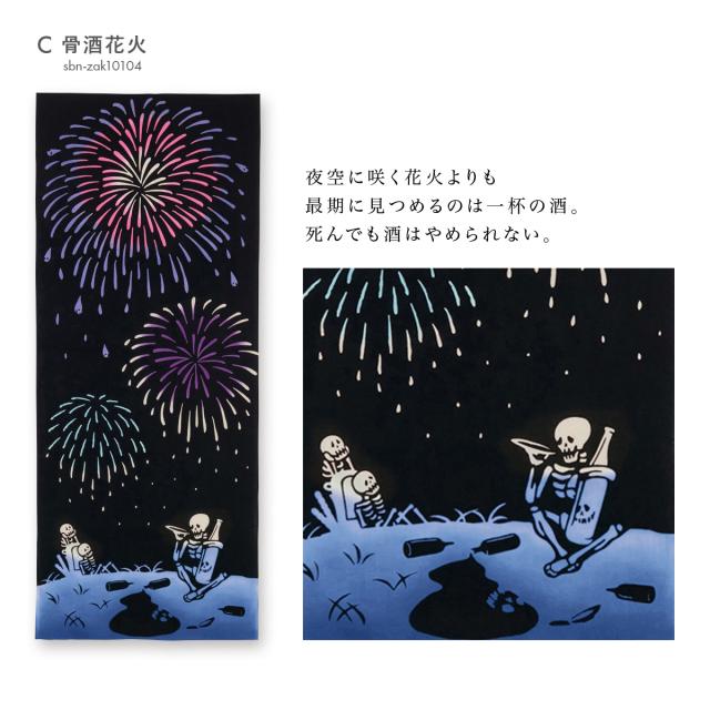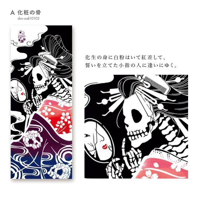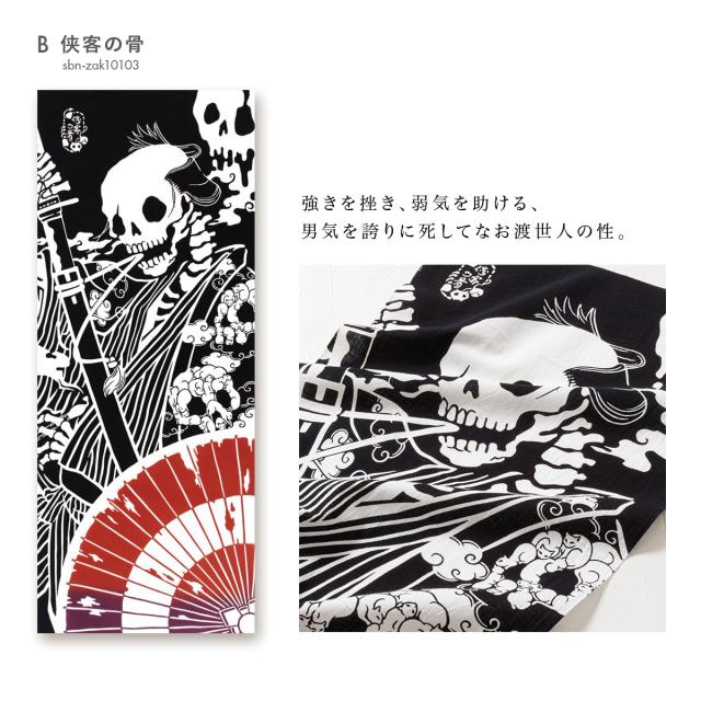 使うほどに柔らかくなる生地に、色と色が混じり合う表現ができる注染で粋で大胆な骸骨がデザインされています。