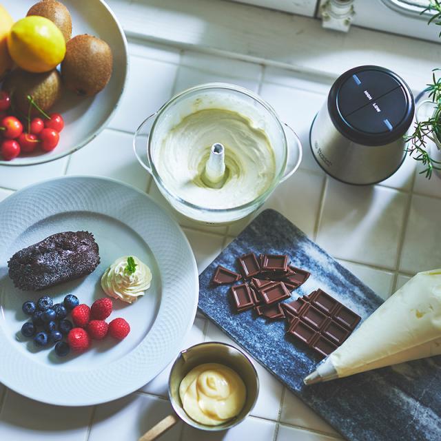 付属のクリームディスクに取り換えれば生クリームも簡単にホイップできるので、お菓子作りにも役立ちます。