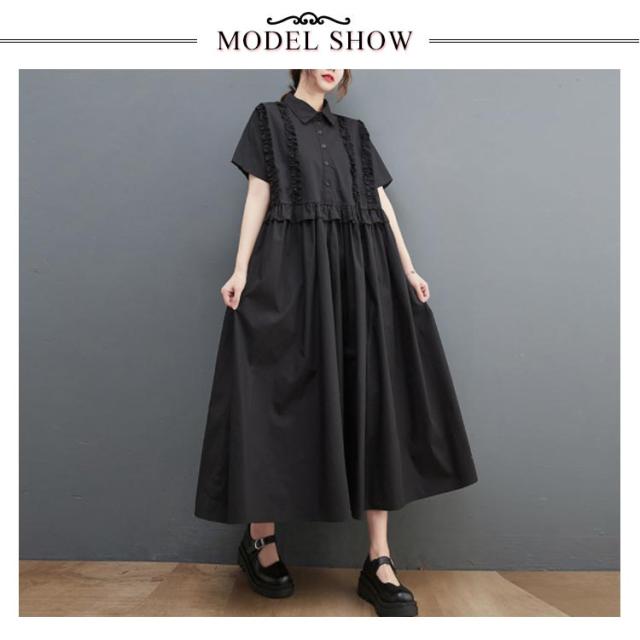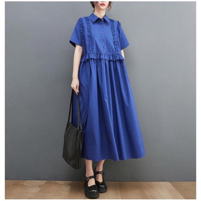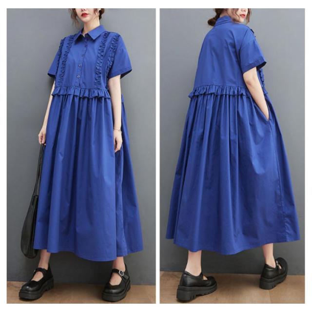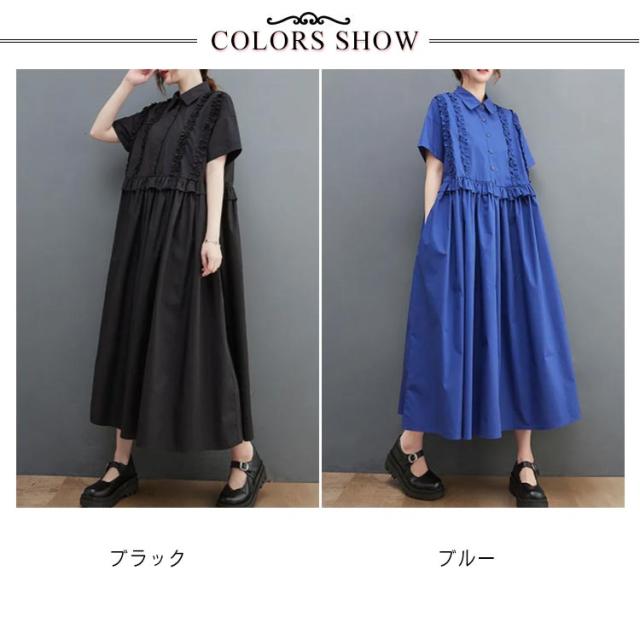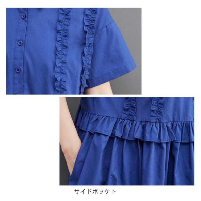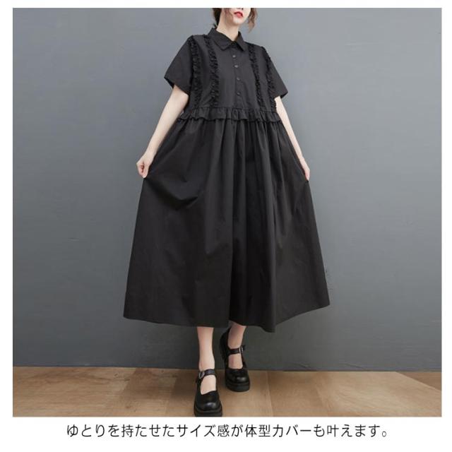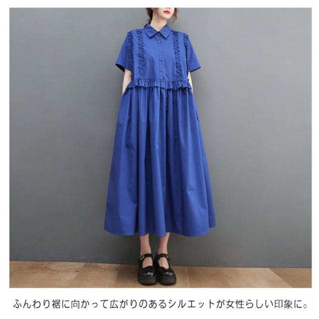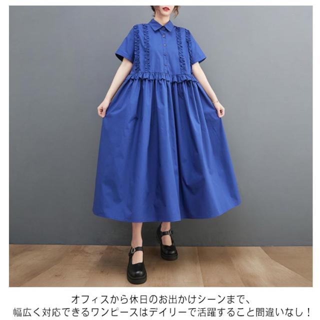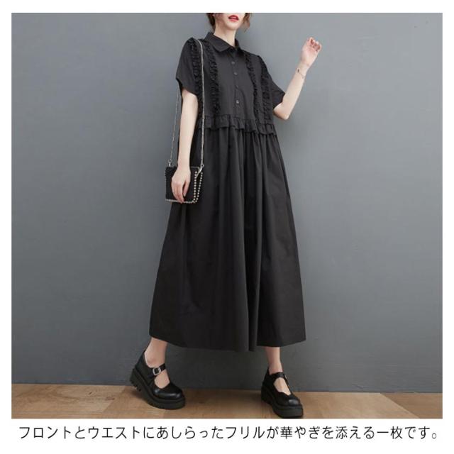 シャツワンピース レディース 半袖 ロングワンピース フリル シャツワンピ ロングシャツ Aライン フレアワンピース 春 夏 ロング丈 ワンピ ウエスト切替 シンプル 無地 ゆったり 大きいサイズ 体型カバー カジュアル きれいめ オフィス 夏新作 春 夏 夏物 夏服 送料無料