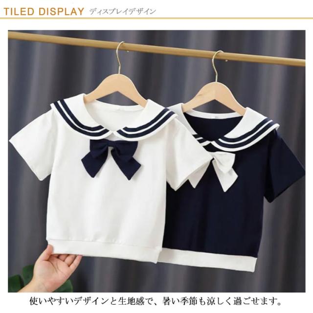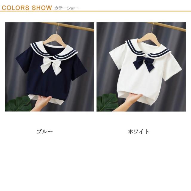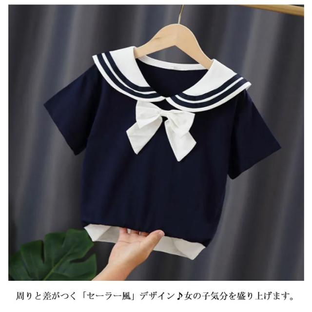 Tシャツ セーラー服 半袖 夏物 可愛い リポン付き 薄手 柔らかい トップス キッズ 子供服 女の子 ジュニア 普段着 記念日 通学 通園 お洒落