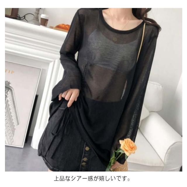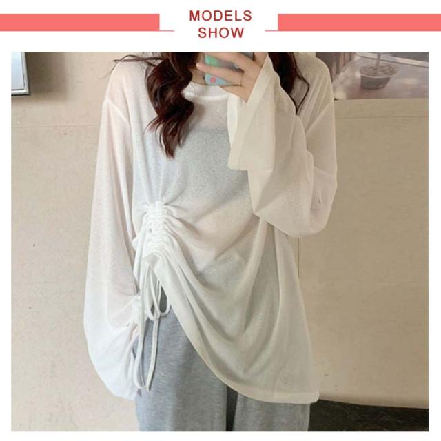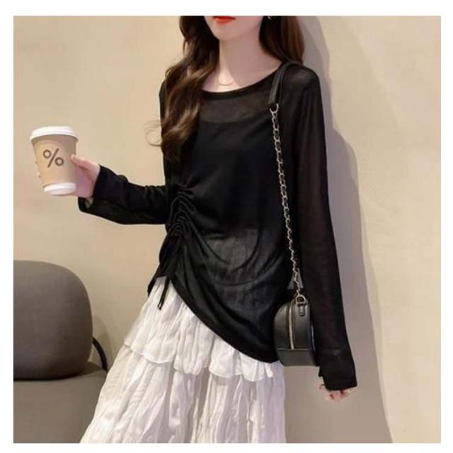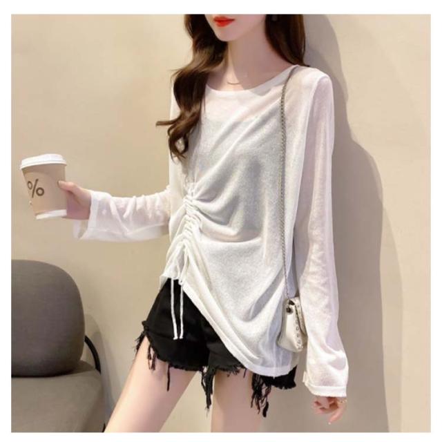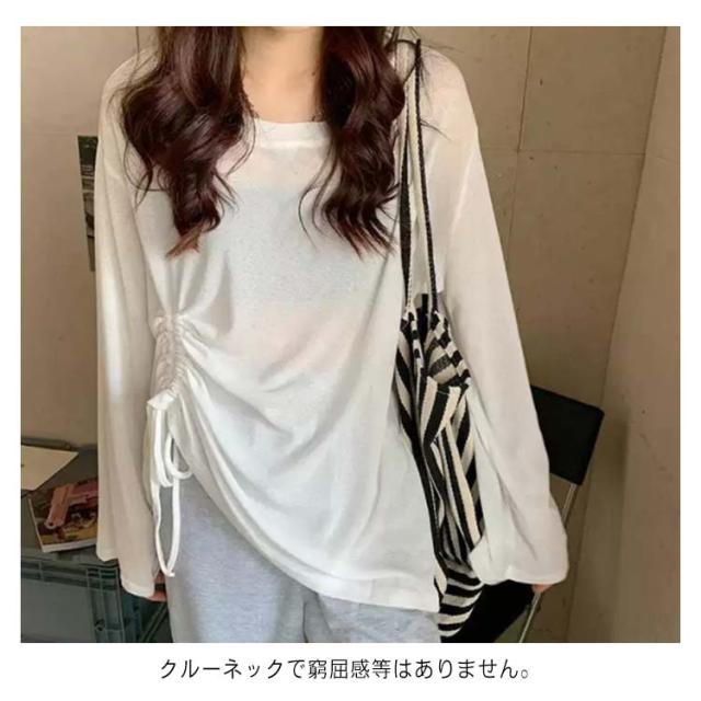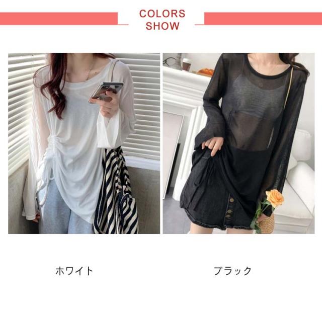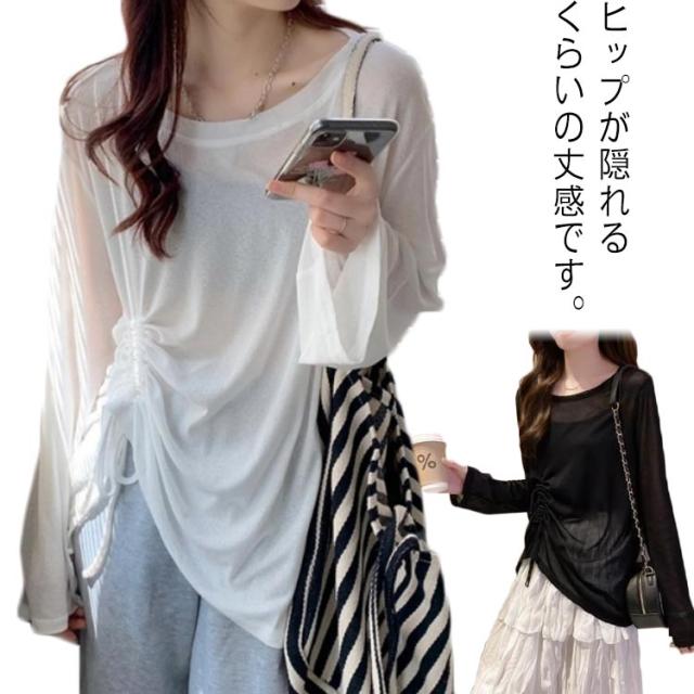 トップス Tシャツ レディース 春 夏 カットソー ブラウス シアーシャツ シアートップス 長袖 UVカット ウエストマーク ウエスト紐 シースルートップス