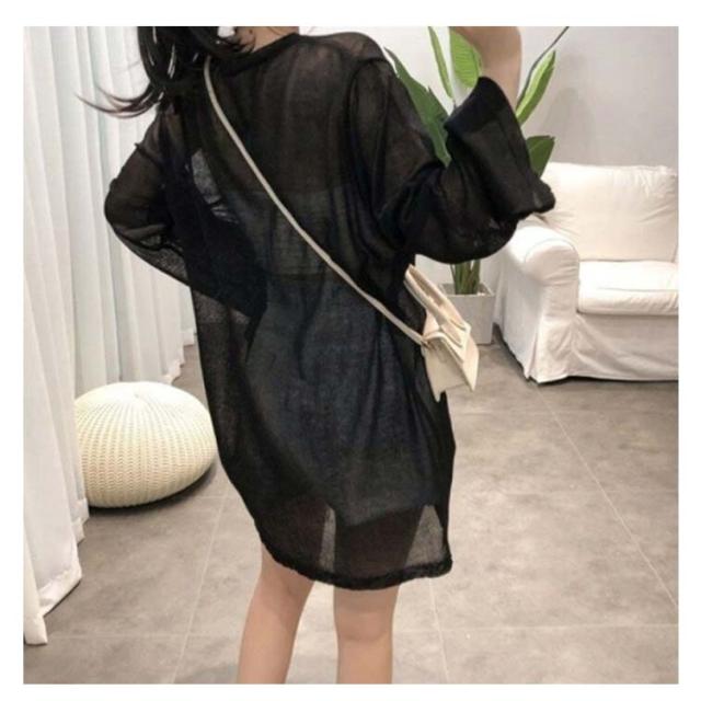 | ヒップが隠れるくらいの丈感です。 クルーネックで窮屈感等はありません。 胸周りゆとりがあります。 生地に伸縮性はありませんが、ゆったりしたサイズなので問題なく着用できました。 上品なシアー感が嬉しいです。 | |