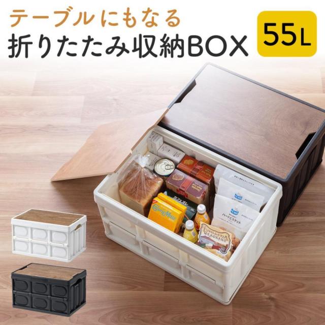 折りたたみコンテナ 木目調フタ付き 容量55L テーブル アウトドア 収納ボックス[100-FC002]