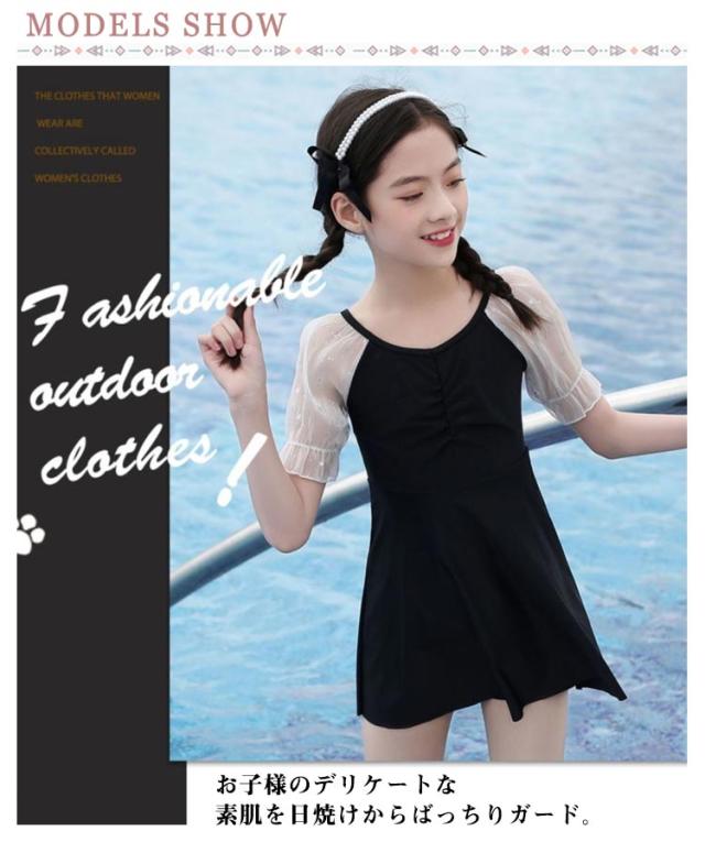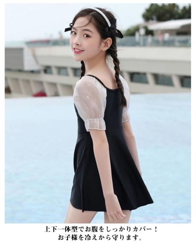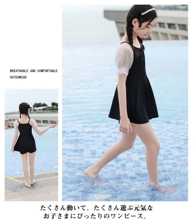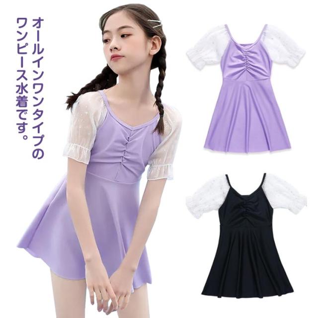 キッズ 水着 女の子 夏 ワンピース オールインワン レース チュール袖 ギャザー 子供用 小学生 ジュニア 女児 女子 子ども 水遊び プール 海 川 アウトドア お洒落 可愛い 体型カバー スイムウェア 幼稚園 80-140cm 送料無料