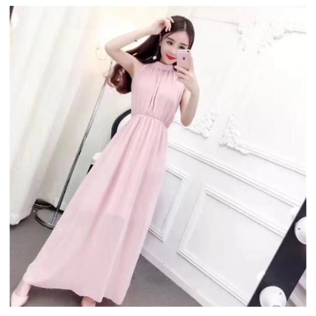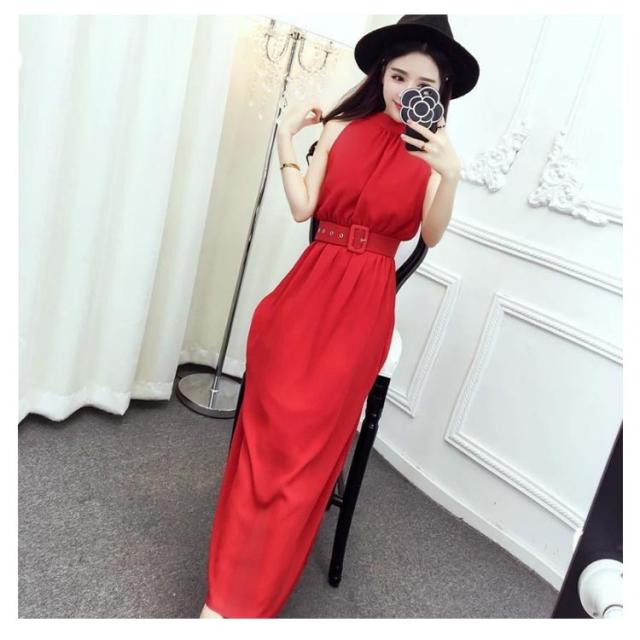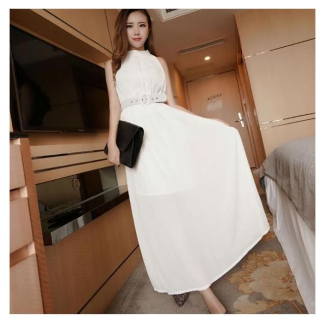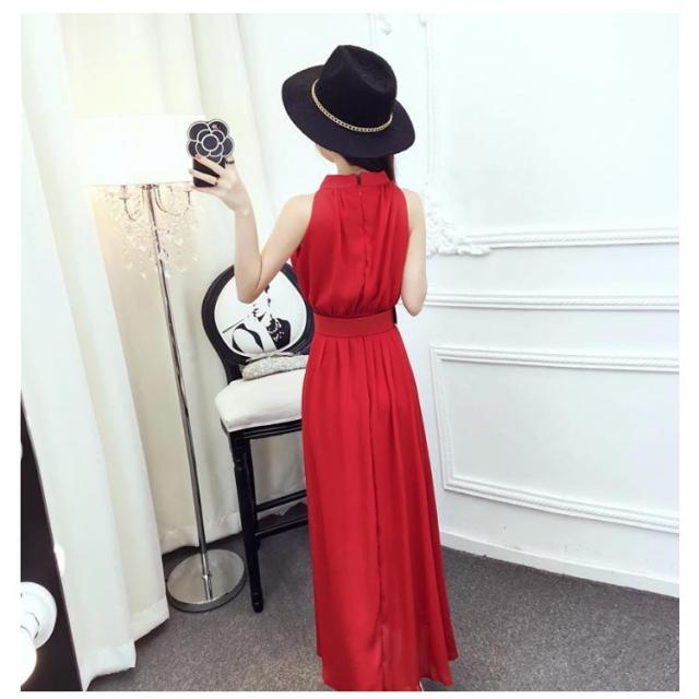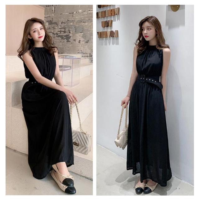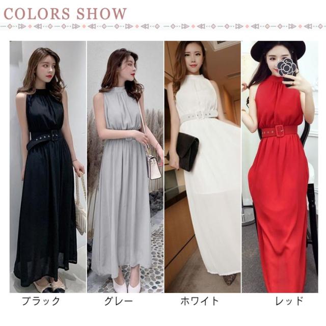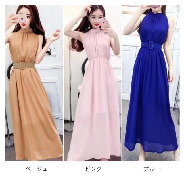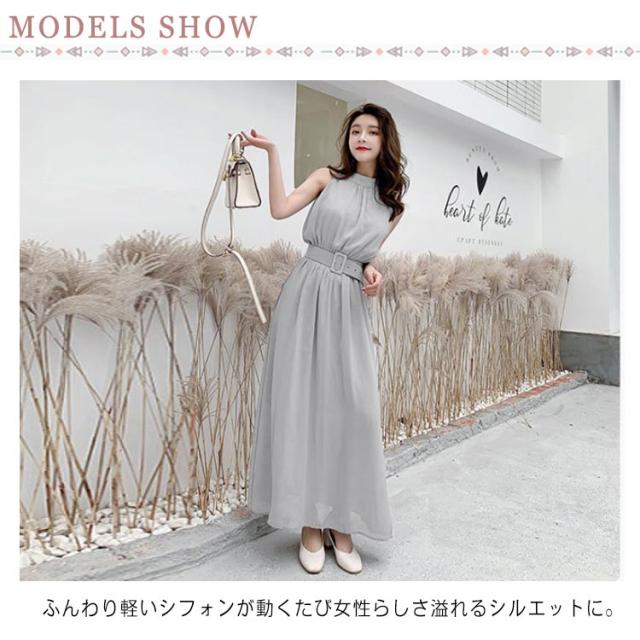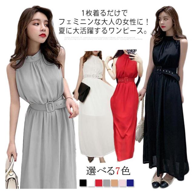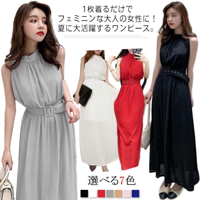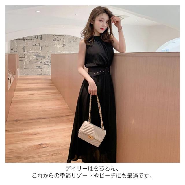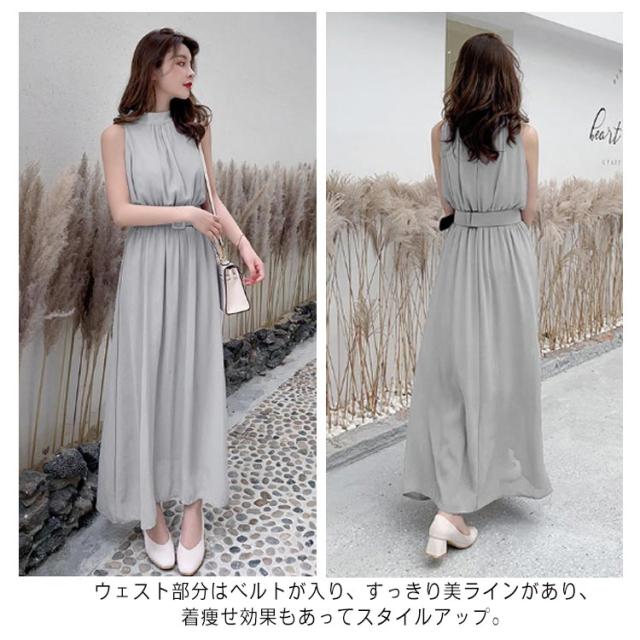 ワンピース ノースリーブ ロング丈 ドレス シフォン きれいめ ふんわり ベルト付き レディース 着痩せ 女子会 パーティー リゾート 夏物 旅行 お洒落