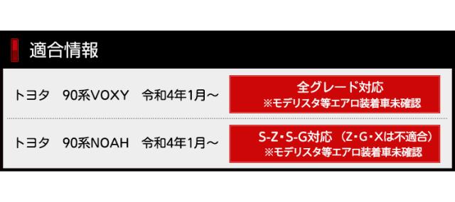| 適合 | 90系 ヴォクシー 令和4年1月〜 全グレード(※モデリスタ等エアロ装着車未確認) 90系 ノア 令和4年1月〜 S-Z/S-G対応(※モデリスタ等エアロ装着車未確認) ※Z/G/Xは不適合 |