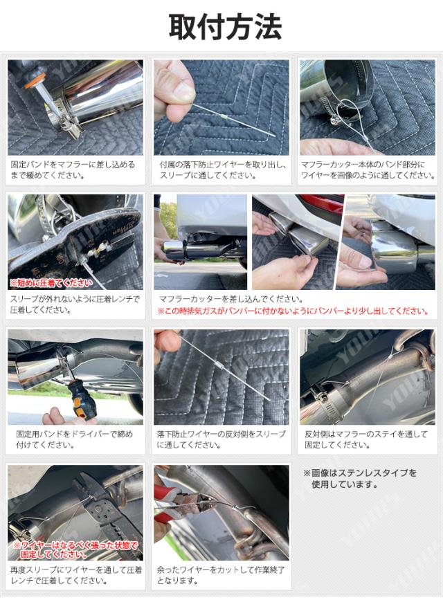 | セット内容 | [1]マフラーカッター本体 ×1 [2]落下防止ワイヤー ×1 [3]ワイヤーロープ専用パーツ ×2 [4]取扱説明書 |