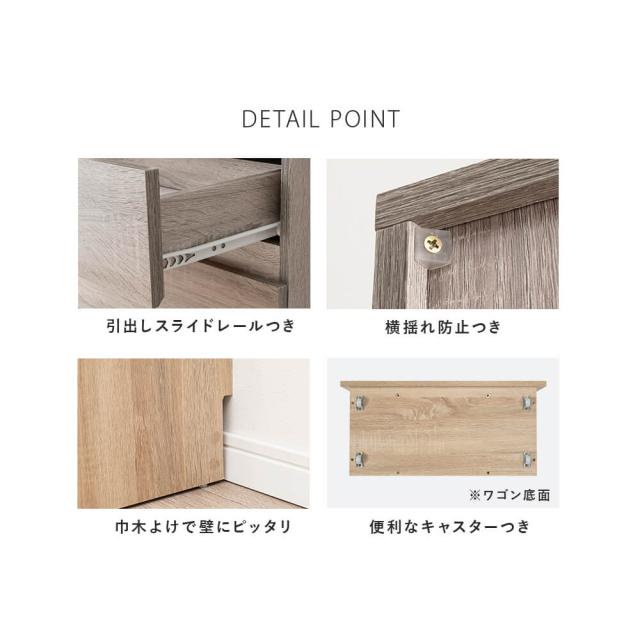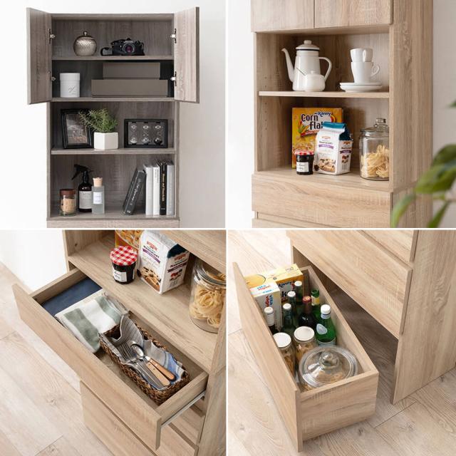 扉付き棚、オープン棚、引出し、キャスター付きワゴンと